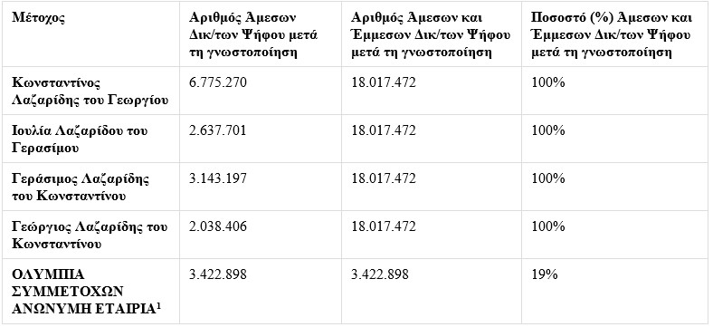 Από την προηγούμενη γνωστοποίηση της εταιρίας «ΟΛΥΜΠΙΑ ΣΥΜΜΕΤΟΧΩΝ ΑΝΩΝΥΜΗ ΕΤΑΙΡΙΑ» έως την 07.10.2025 (ημερομηνία ολοκλήρωσης άσκησης του δικαιώματος εξαγοράς που εγκρίθηκε από το Διοικητικό Συμβούλιο της Επιτροπής Κεφαλαιαγοράς με την υπ’ αριθμ. 5/1062/16.09.2025 απόφασή του), η ανώνυμη εταιρία με την επωνυμία «ΟΛΥΜΠΙΑ ΣΥΜΜΕΤΟΧΩΝ ΑΝΩΝΥΜΗ ΕΤΑΙΡΕΙΑ» απέκτησε συνολικά 718.303 μετοχές της Εταιρείας, που αντιστοιχούν σε 3,99% του συνόλου των μετοχών και των δικαιωμάτων ψήφου της Εταιρίας. Κατά συνέπεια, στις 07.10.2025 επήλθε μεταβολή μεγαλύτερη του 3% επί του ποσοστού των δικαιωμάτων ψήφου της Εταιρείας που κατέχει η εταιρία «ΟΛΥΜΠΙΑ ΣΥΜΜΕΤΟΧΩΝ ΑΝΩΝΥΜΗ ΕΤΑΙΡΕΙΑ» στην Εταιρεία, η οποία πλέον κατέχει 3.422.898 μετοχές και δικαιώματα ψήφου της Εταιρίας, που αντιστοιχούν στο 19% των μετοχών και δικαιωμάτων ψήφου της Εταιρίας.