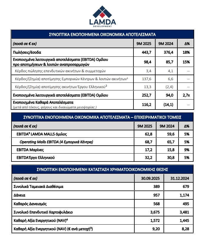 Ενοποιημένα κέρδη EBITDA που αυξήθηκαν κατά 2,7 φορές, στα €253εκ, σε σχέση με το Εννεάμηνο 2024 και ενοποιημένα Καθαρά Αποτέλεσμα του Ομίλου στα €116εκ έναντι ζημιών το Εννεάμηνο 2024, ανακοίνωσε η Lamda Development.