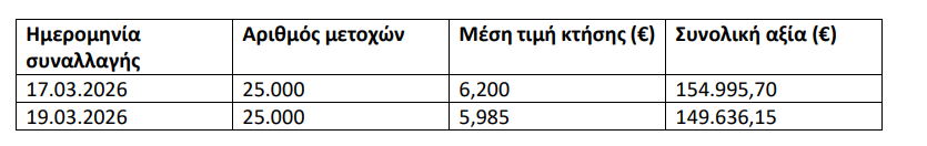 Οι συναλλαγές πραγματοποιήθηκαν μέσω του Χρηματιστηρίου Αθηνών το διάστημα 16 έως 20 Μαρτίου 2026, σε συνέχεια των αποφάσεων της Γενικής Συνέλευσης και του Διοικητικού Συμβουλίου της εταιρείας.
