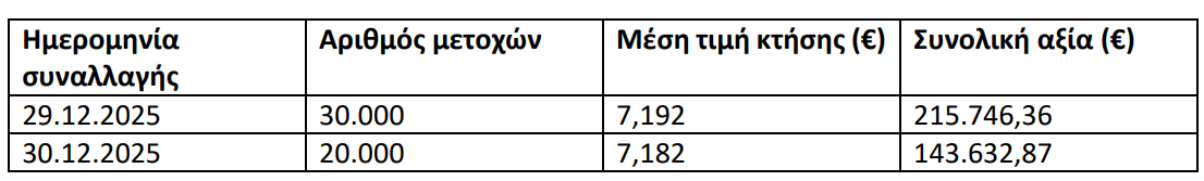 Η LAMDA Development S.A. (η «Εταιρεία»), σε εκτέλεση της απόφασης της Τακτικής Γενικής Συνέλευσης των μετόχων της 26ης Ιουνίου 2025 καθώς καιτης από 26ης Ιουνίου 2025 απόφασης του Διοικητικού Συμβουλίου της Εταιρείας και σε συνέχεια της από 27ης Ιουνίου 2025 ανακοίνωσης για την έναρξη του προγράμματος αγοράς ιδίων μετοχών, ανακοινώνει ότι κατά το χρονικό διάστημα 29.12.2025 – 30.12.2025 προέβη σε αγορά 50.000 ιδίων μετοχών ως ακολούθως: