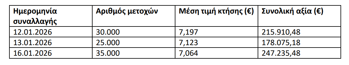 Η LAMDA Development S.A. (η «Εταιρεία»), σε εκτέλεση της απόφασης της Τακτικής Γενικής Συνέλευσης των μετόχων της 26ης Ιουνίου 2025 καθώς και της από 26ης Ιουνίου 2025 απόφασης του Διοικητικού Συμβουλίου της Εταιρείας και σε συνέχεια της από 27ης Ιουνίου 2025 ανακοίνωσης για την έναρξη του προγράμματος αγοράς ιδίων μετοχών, ανακοινώνει ότι κατά το χρονικό διάστημα 12.01.2026 – 16.01.2026 προέβη σε αγορά 90.000 ιδίων μετοχών ως ακολούθως: