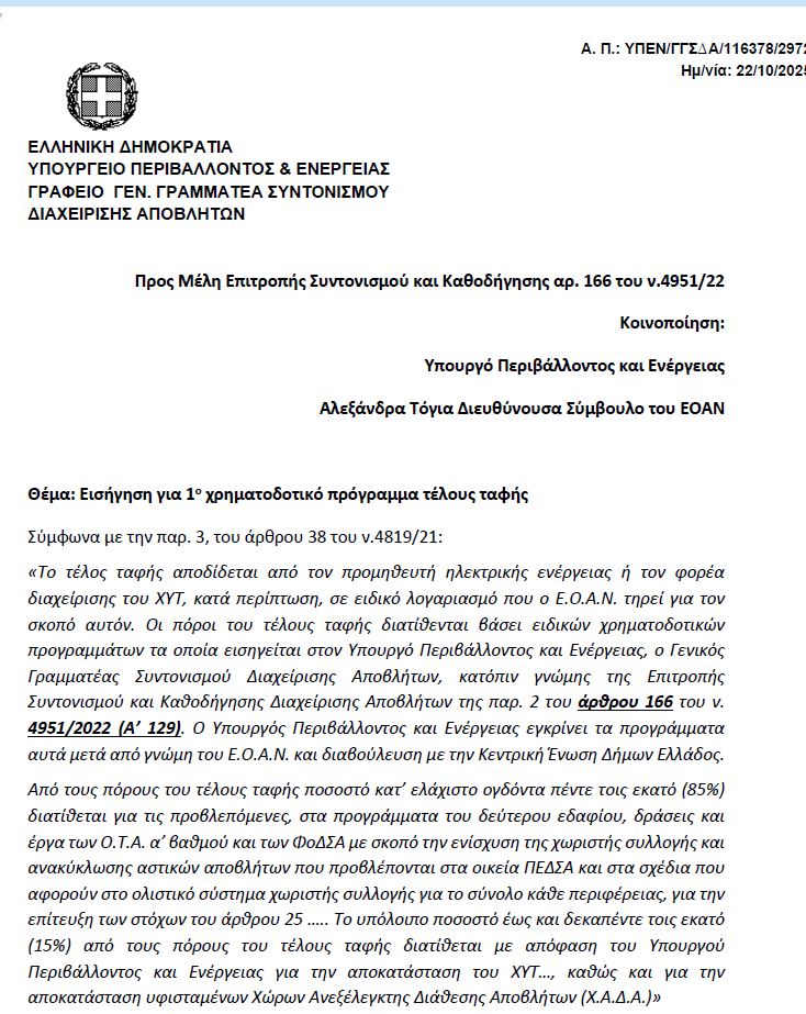 «Από τους πόρους του τέλους ταφής ποσοστό κατ’ ελάχιστον ογδόντα πέντε τοις εκατό (85%) διατίθεται για τις προβλεπόμενες, στα προγράμματα του δευτέρου εδαφίου, δράσεις και έργα των Ο.Τ.Α. α’ βαθμού και των ΦοΔΣΑ με σκοπό την ενίσχυση της χωριστής συλλογής και ανακύκλωσης αστικών αποβλήτων που προβλέπονται στα οικεία ΠΕΣΔΑ και στα σχέδια που αφορούν στο ολιστικό σύστημα χωριστής συλλογής για το σύνολο κάθε περιφέρειας, για την επίτευξη των στόχων του άρθρου 25 …. Το υπόλοιπο ποσοστό έως και δεκαπέντε τοις εκατό (15%) από τους πόρους του τέλους ταφής διατίθεται με απόφαση του Υπουργού Περιβάλλοντος και Ενέργειας για την αποκατάσταση ΧΥΤ, …, καθώς και για την αποκατάσταση υφισταμένων Χώρων Ανεξέλεγκτης Διάθεσης Αποβλήτων (Χ.Α.Δ.Α.)».