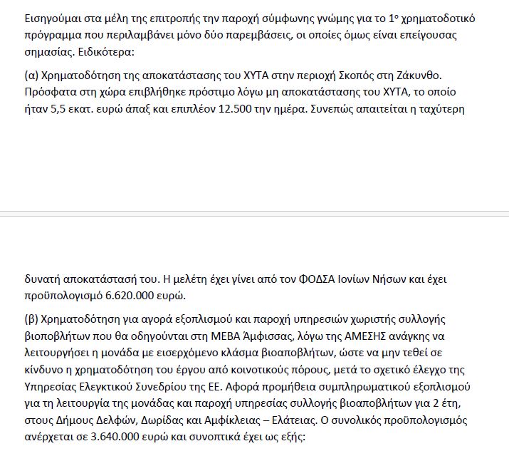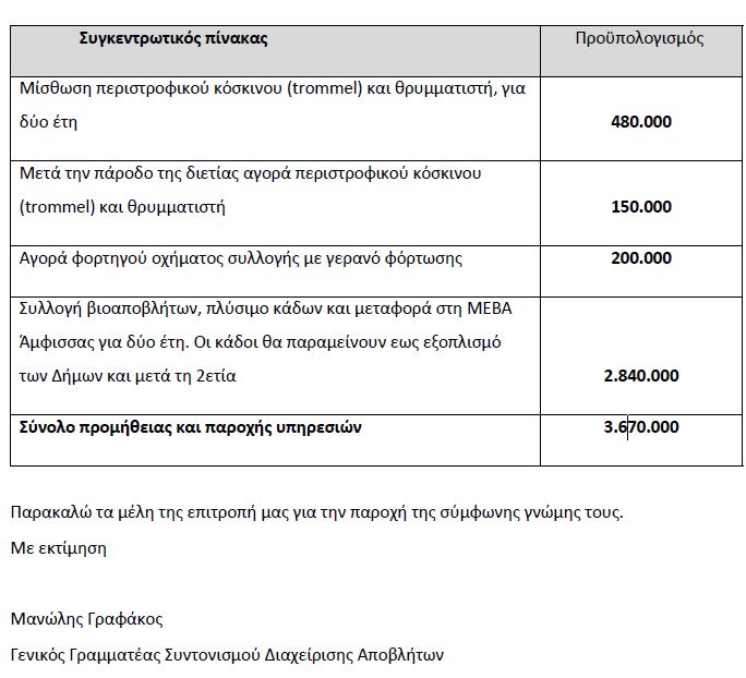 «Χρηματοδότηση για αγορά εξοπλισμού και παροχή υπηρεσιών χωριστής συλλογής βιοποβλήτων που θα οδηγούνται στη ΜΕΒΑ Άμφισσας, λόγω της ΑΜΕΣΗΣ ανάγκης να λειτουργήσει η μονάδα με εισερχόμενο κλάσμα βιοαποβλήτων».