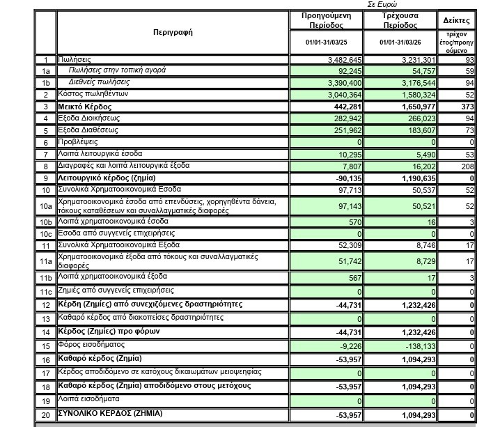 Ειδικότερα, οι πωλήσεις στο πρώτο τρίμηνο του 2026, διαμορφώθηκαν στα 3,23 εκ. ευρώ, έναντι 3,48 εκ. ευρώ το αντίστοιχο διάστημα του 2025.