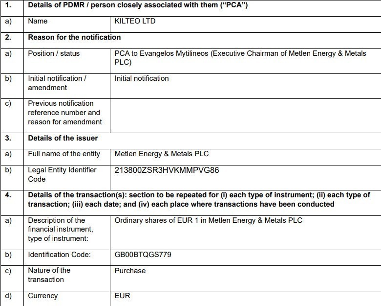 H Kilteo Ltd, εταιρεία που συνδέεται με τον πρόεδρο και διευθύνοντα σύμβουλο Ευάγγελο Μυτιληναίο, απέκτησε 50.000 μετοχές της Metlen στην τιμή των 32,5918 ευρώ ανά μετοχή, σύμφωνα με ανακοίνωση της Metlen.