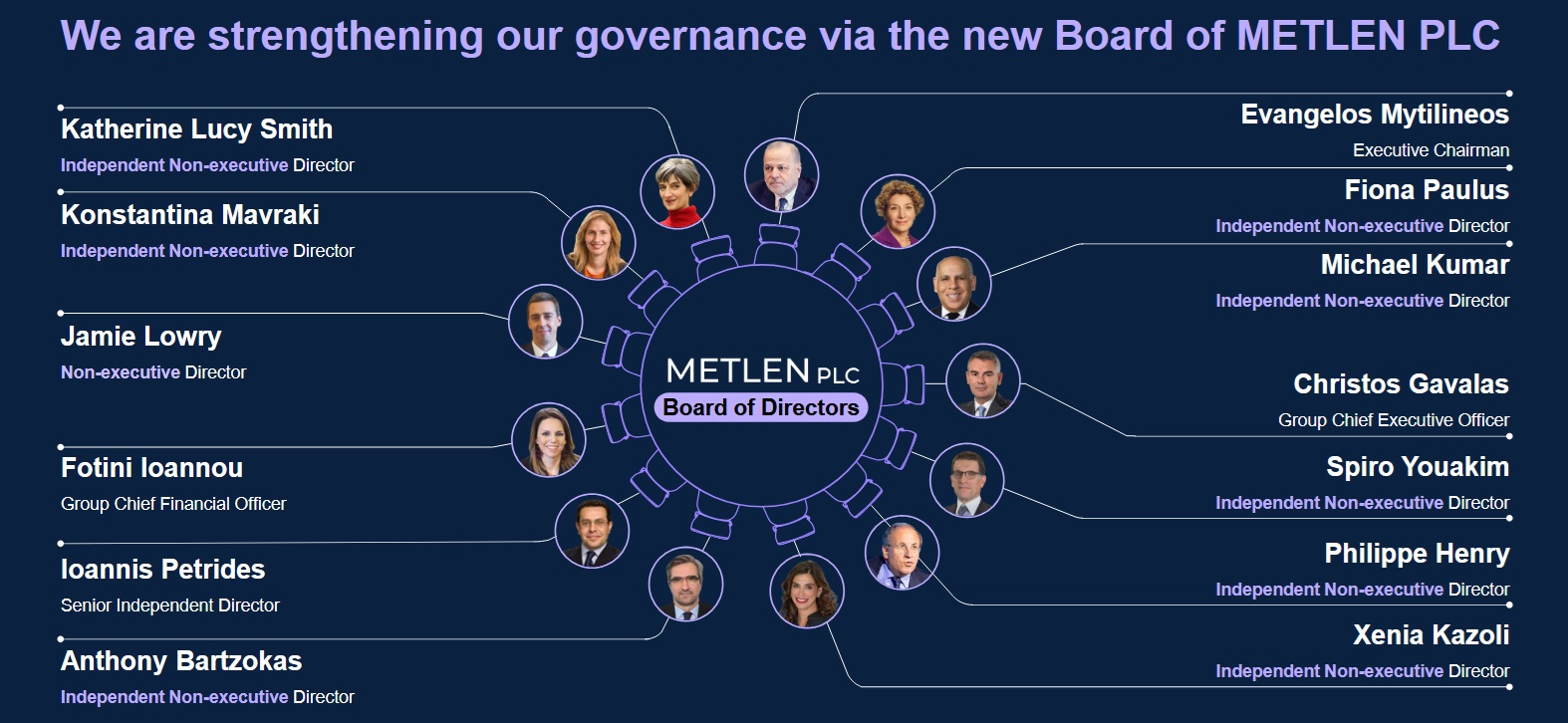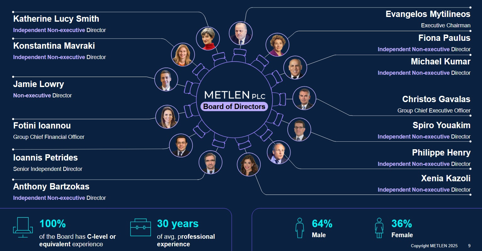 Παράλληλα, με τη νέα ηγετική της ομάδα, 0 όμιλος Metlen αναβαθμίζει και την εταιρική της διακυβέρνηση, με ένα νέο, ενισχυμένο συμβούλιο για τη Melten PLC, με την προσθήκη σειράς ανεξάρτητων μη εκτελεστικών μελών με βαθιά διεθνή εμπειρία: