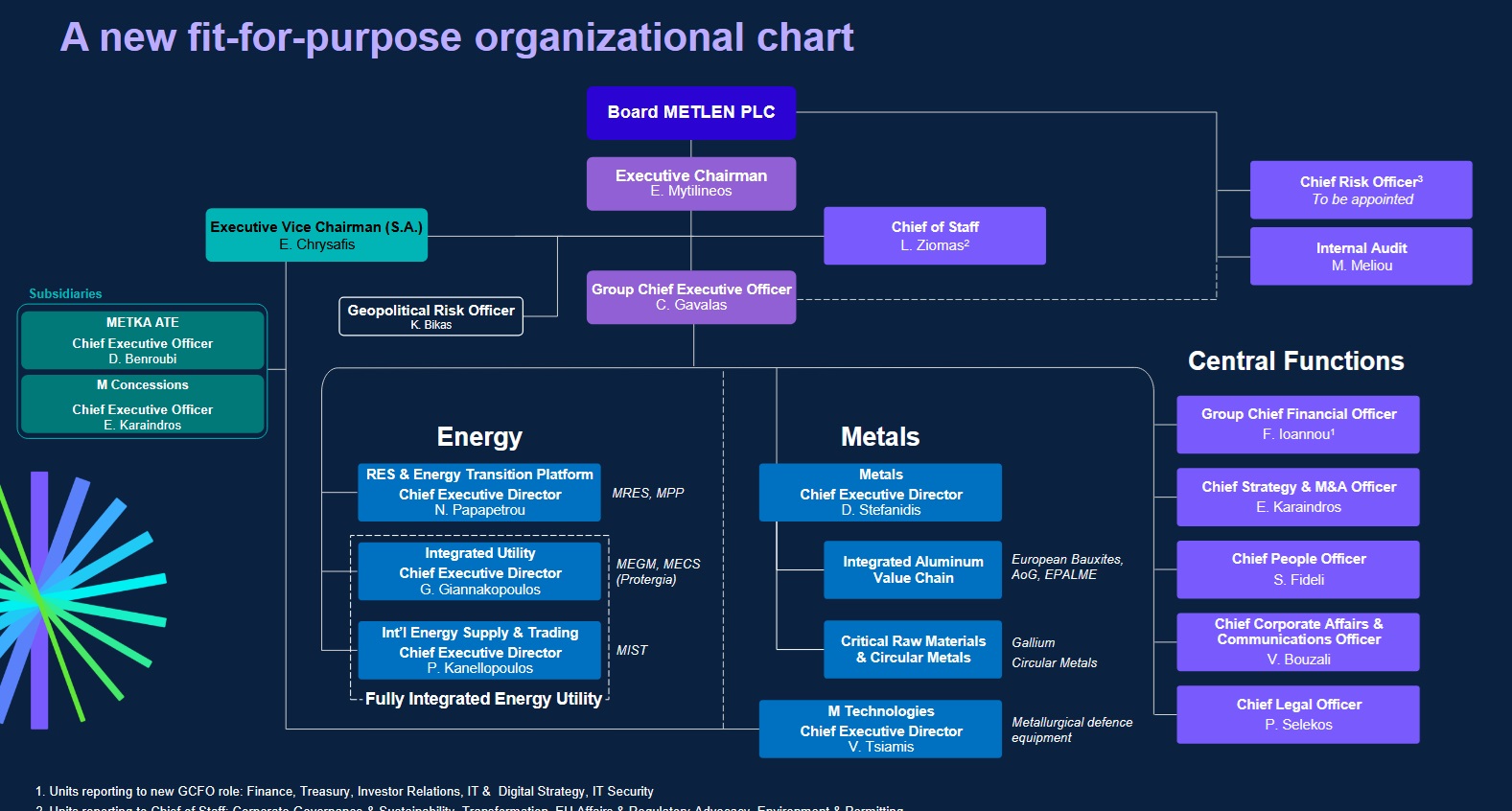 Στο πλαίσιο αυτής της στρατηγικής μεταμόρφωσης, οι βασικές αλλαγές και οι κύριοι διορισμοί στην ομάδα ηγεσίας και στη δομή της METLEN παρουσιάζονται παρακάτω: