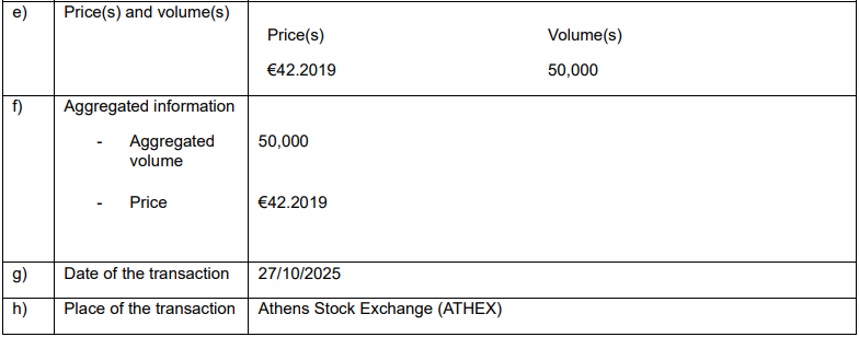 Η συναλλαγή έγινε στο Χρηματιστήριο Αθηνών με τιμή 44,1077 ευρώ ανά μετοχή, ανεβάζοντας το συνολικό κόστος της επένδυσης στα 661.615 ευρώ περίπου.