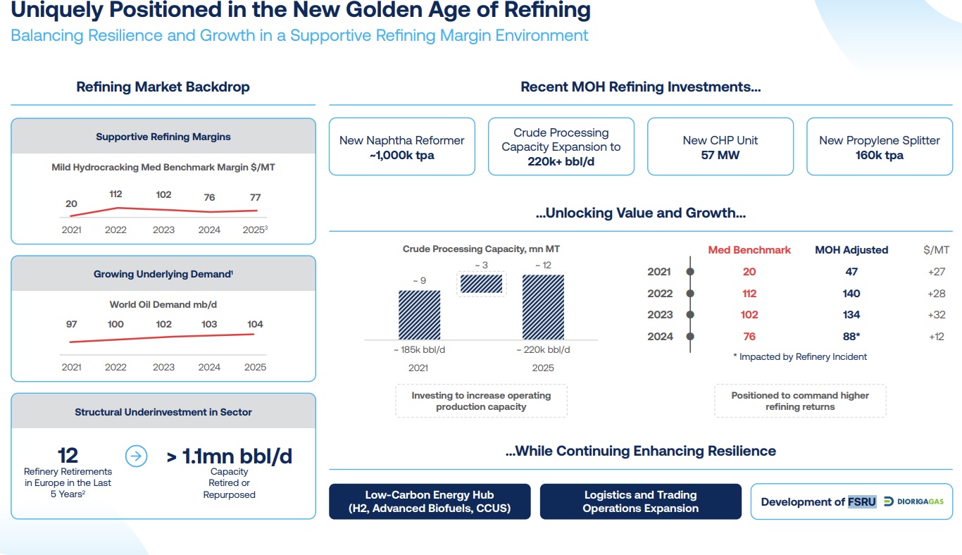 Η διύλιση παραμένει η δύναμη και το βασικό ανταγωνιστικό πλεονέκτημα του Ομίλου.Παρά το γεγονός ότι το ευρωπαϊκό σύστημα διύλισης παρέμενε ένας τομέας με ανεπαρκείς επενδύσεις τα τελευταία χρόνια, η Motor Oil συνέχισε να επενδύει με αποτέλεσμα να διαθέτει σήμερα ένα από τα πιο σύγχρονα και σύνθετα διυλιστήρια στη Μεσόγειο, γεγονός που προσδίδει στον Όμιλο σημαντικό ανταγωνιστικό πλεονέκτημα για τα επόμενα χρόνια.