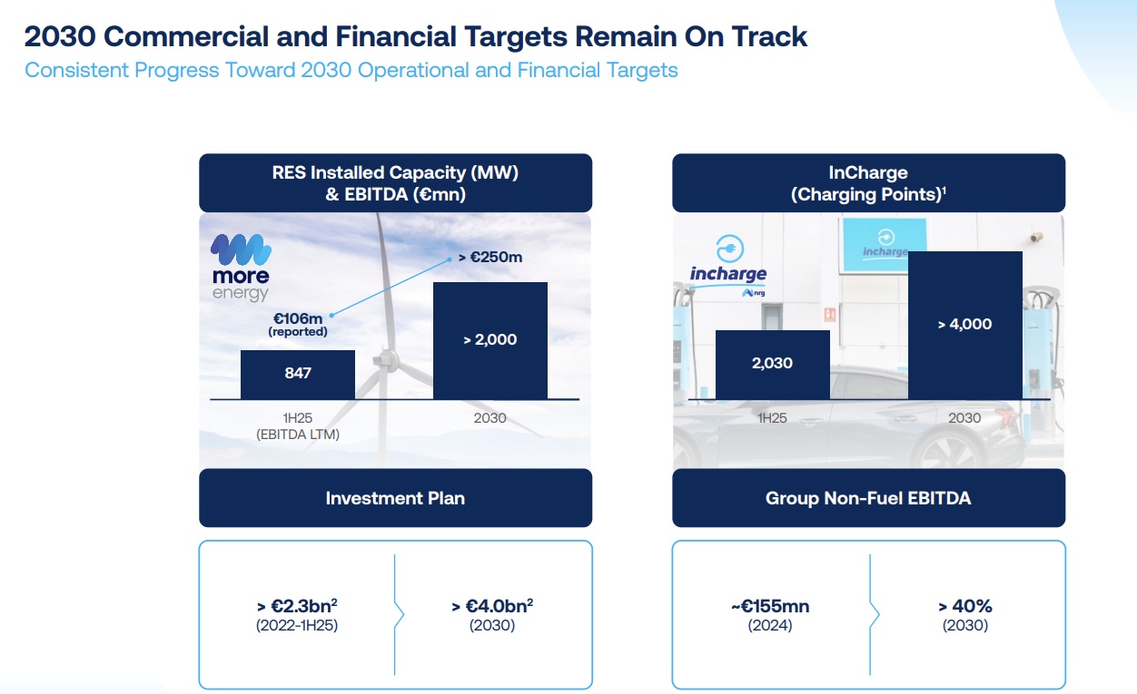 Η MORE συστηματικά επενδύει σε αιολικά και φωτοβολταϊκά πάρκα, καθώς και συστήματα αποθήκευσης που ενισχύουν τη σταθερότητα του εθνικού δικτύου διανομής ηλεκτρικής ενέργειας. Τα έργα προχωρούν ώστε μέχρι το 2030 η ΜΟRE να έχει ξεπεράσει τον στόχο των 2GW εγκατεστημένης ισχύος και τα €250 εκατ. EBITDA.