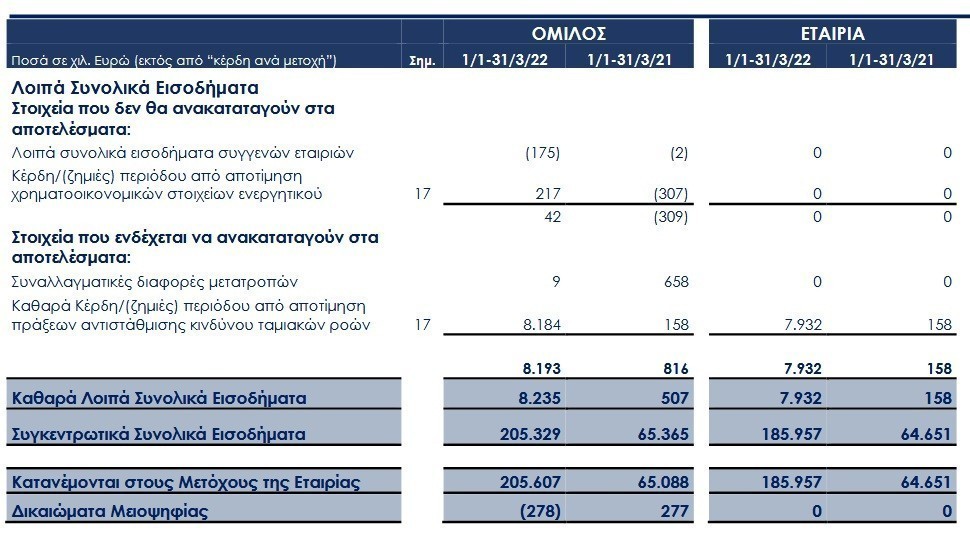 Τα καθαρά κέρδη από συνεχιζόμενες δραστηριότητες διαμορφώθηκαν στα 197 εκατ. ευρώ έναντι 64 εκατ. ευρώ το πρώτο τρίμηνο του 2021.