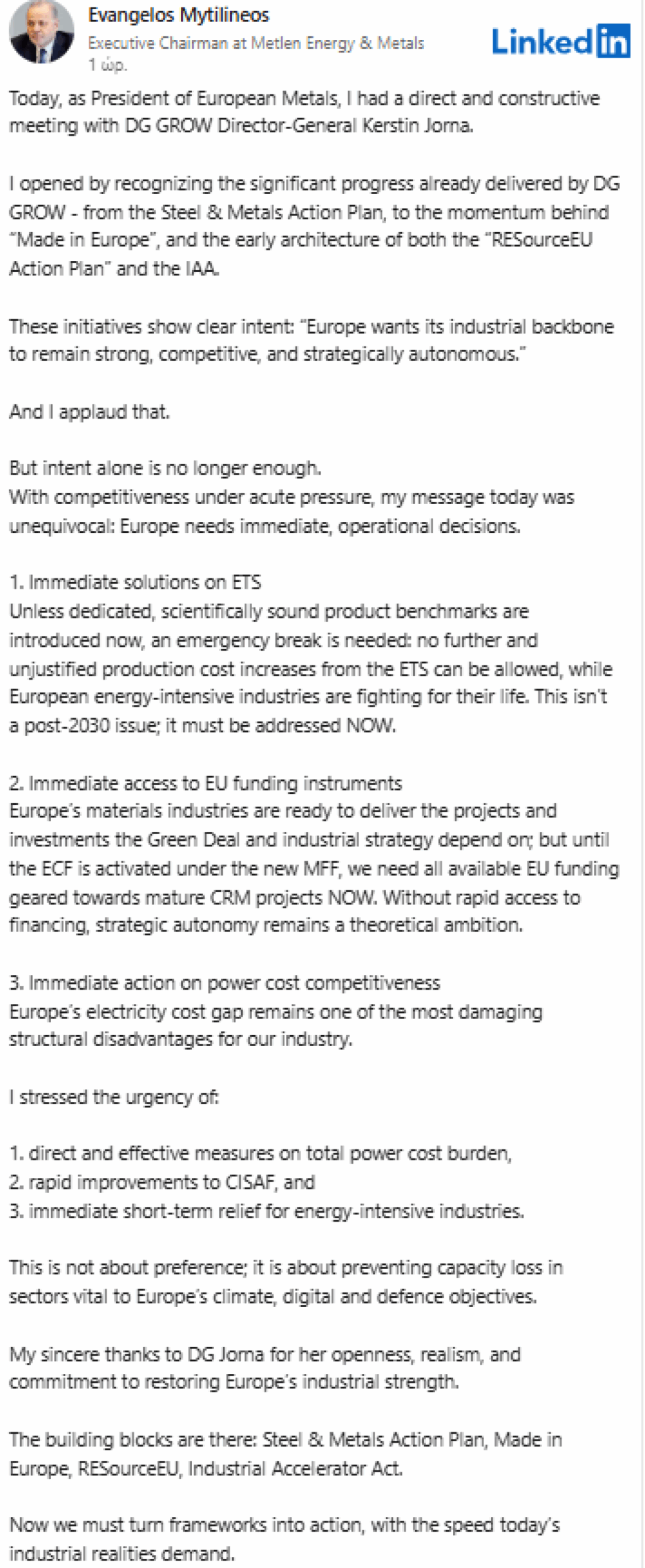 Νέα παρέμβαση πραγματοποίησε Ευάγγελος Μυτιληναίος ως πρόεδρος της Eurometaux, μετά τη συνάντηση με τη Γενική Διευθύντρια της DG GROW, Kerstin Jorna θέτοντας ευθέως μέσω ανάρτησης στο LinkedIn το ζήτημα της επιβίωσης της ευρωπαϊκής βιομηχανίας και ζητώντας άμεσες, επιχειρησιακές αποφάσεις από τις Βρυξέλλες για ενέργεια, χρηματοδότηση και ETS, εν μέσω οξυμένης πίεσης στην ανταγωνιστικότητα.