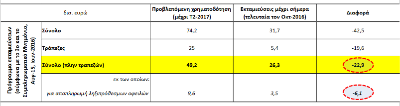 Υπενθυμίζεται ότι τα ταμειακά διαθέσιμα του Ελληνικού Δημοσίου σύμφωνα με το χρηματοδοτικό προγραμματισμό και αν οι εκταμιεύσεις εξελίσσονταν ομαλά, θα έπρεπε να είναι 7 δισ. ευρώ στο τέλος Μαρτίου και 15 δισ. ευρώ στο τέλος Ιουνίου του 2017. Δημιουργώντας, έτσι, από σήμερα, τις προϋποθέσεις για έξοδο στις αγορές. Αντ’ αυτού, στο τέλος Μαρτίου, τα ταμειακά διαθέσιμα ανέρχονταν, μόλις, στα 3 δισ. ευρώ.