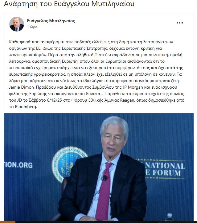 «Κάθε φορά που αναφέρομαι στις σοβαρές ελλείψεις στη δομή και τη λειτουργία της Ευρ. Επιτροπής, δέχομαι έντονη κριτική για «αντιευρωπαϊσμό»», επισημαίνει με ανάρτησή του στο Linkedin ο Ευάγγελος Μυτιληναίος. Τα ίδια, όμως όπως τόνιζει, υποστηρίζει και ο Jamie Dimon.
