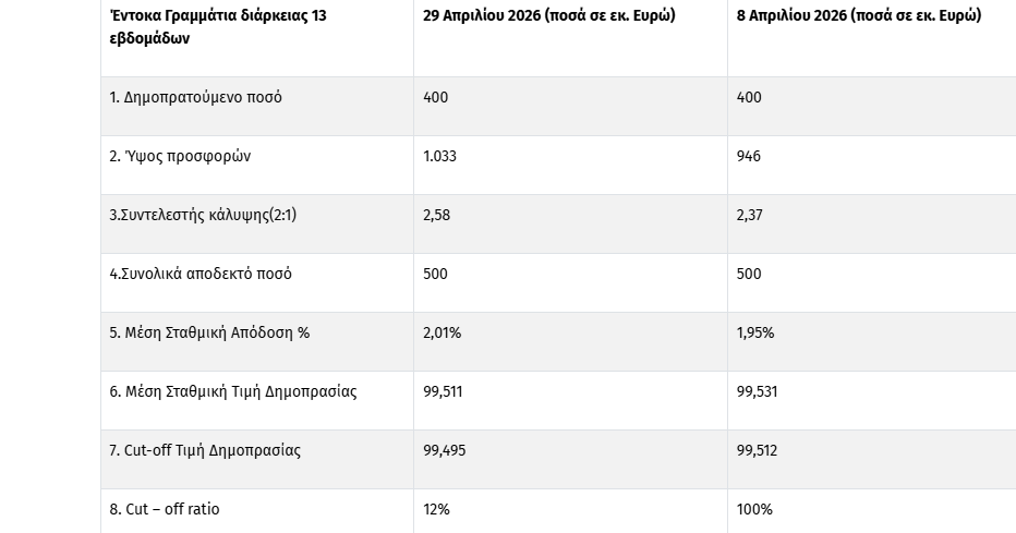 Η δημοπρασία πραγματοποιήθηκε μέσω των Βασικών Διαπραγματευτών Αγοράς (Primary Dealers), και η ημερομηνία διακανονισμού είναι η Δευτέρα 4 Μαΐου 2026.