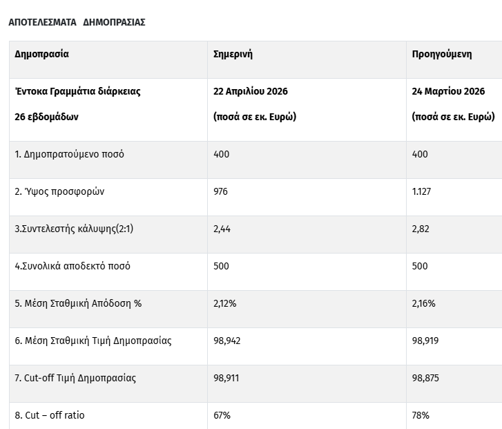 Η δημοπρασία πραγματοποιήθηκε μέσω των Βασικών Διαπραγματευτών Αγοράς (Primary Dealers), και η ημερομηνία διακανονισμού είναι η Παρασκευή 24 Απριλίου 2026.
