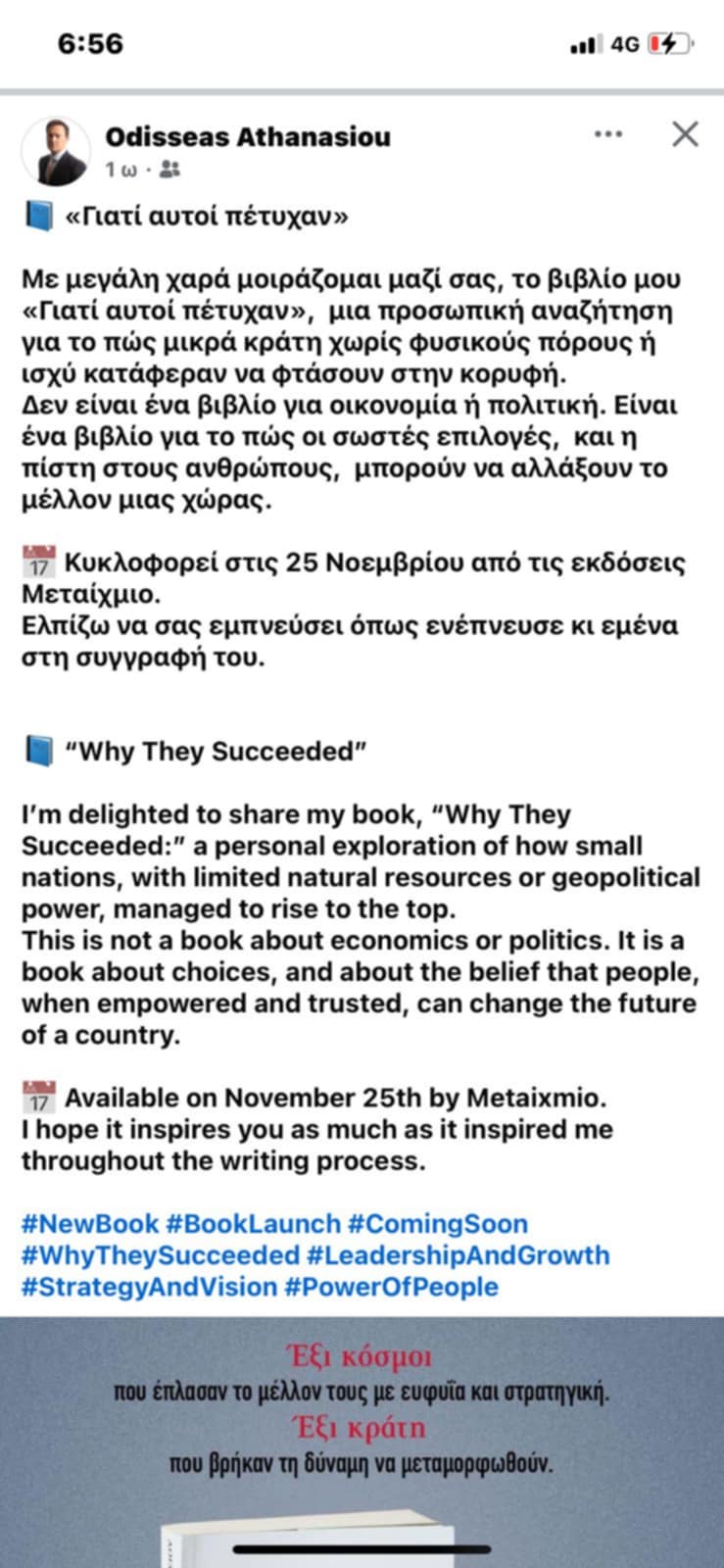 Σε προσωπική του ανάρτηση στα social media, ο Οδυσσέας Αθανασίου σημειώνει ότι το βιβλίο αποτελεί «μία προσωπική αναζήτηση για το πώς μικρά κράτη, χωρίς φυσικούς πόρους, έφτασαν στην κορυφή» και προσθέτει πως αποτελεί «ένα βιβλίο για το πώς οι σωστές επιλογές και η πίστη στους ανθρώπους μπορούν ν’ αλλάξουν το μέλλον μίας χώρας»