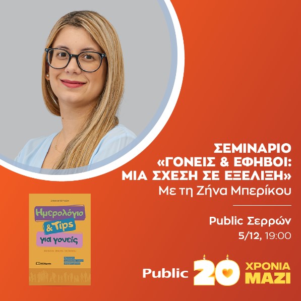 Τα Public και τα Φροντιστήρια Πουκαμισάς Σέρρες Κέντρο σε προσκαλούν στην εκδήλωση «Γονείς & Έφηβοι: Μια Σχέση σε Εξέλιξη», ένα Σεμινάριο Συμβουλευτικής Γονέων με αφορμή την κυκλοφορία του νέου βιβλίου της Ζήνας Μπερίκου, «Ημερολόγιο & tips για γονείς».