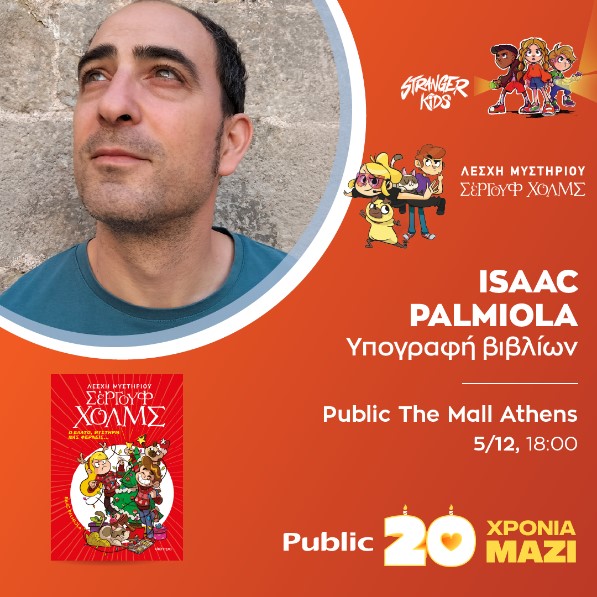 Τα Public και οι εκδόσεις Διόπτρα σε προσκαλούν να γνωρίσεις από κοντα τον συγγραφέα των αγαπημένων παιδικών σειρών Λέσχη μυστηρίου Σέργουφ Χόλμς και Stranger Kids, Isaac Palmiola, σε μια συνάντηση γεμάτη Χριστουγεννιάτικη μαγεία και… μυστήριο!