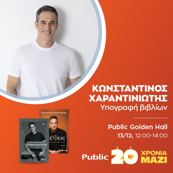 Τα Public και οι εκδόσεις Πεδίο σε προσκαλούν σε μια ξεχωριστή συνάντηση με τον συγγραφέα, δάσκαλο και ομιλητή Κωνσταντίνο Χαραντινιώτη, το Σάββατο 13 Δεκεμβρίου, στο Public Golden Hall. Από τις 12:00 έως τις 14:00, ο συγγραφέας θα υπογράφει αντίτυπα των best seller βιβλίων του «Νοοτροπία» και «Σκέψεις», και θα συνομιλήσει με το κοινό για την προσωπική ανάπτυξη, την ισορροπία και τη δύναμη της συνειδητής ζωής.