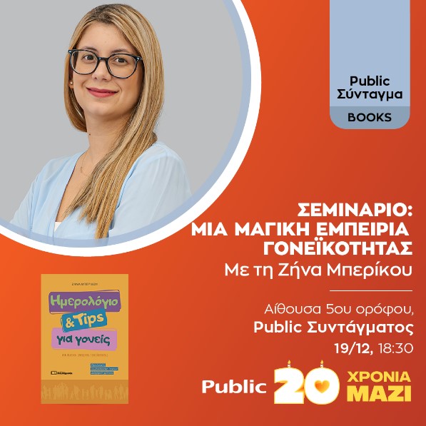 Τα Public και οι εκδόσεις Πουκαμισάς σε προσκαλούν στην εκδήλωση «Μια μαγική εμπειρία γονεϊκότητας», ένα Σεμινάριο Συμβουλευτικής Γονέων με αφορμή την κυκλοφορία του νέου βιβλίου της Ζήνας Μπερίκου, «Ημερολόγιο & tips για γονείς».