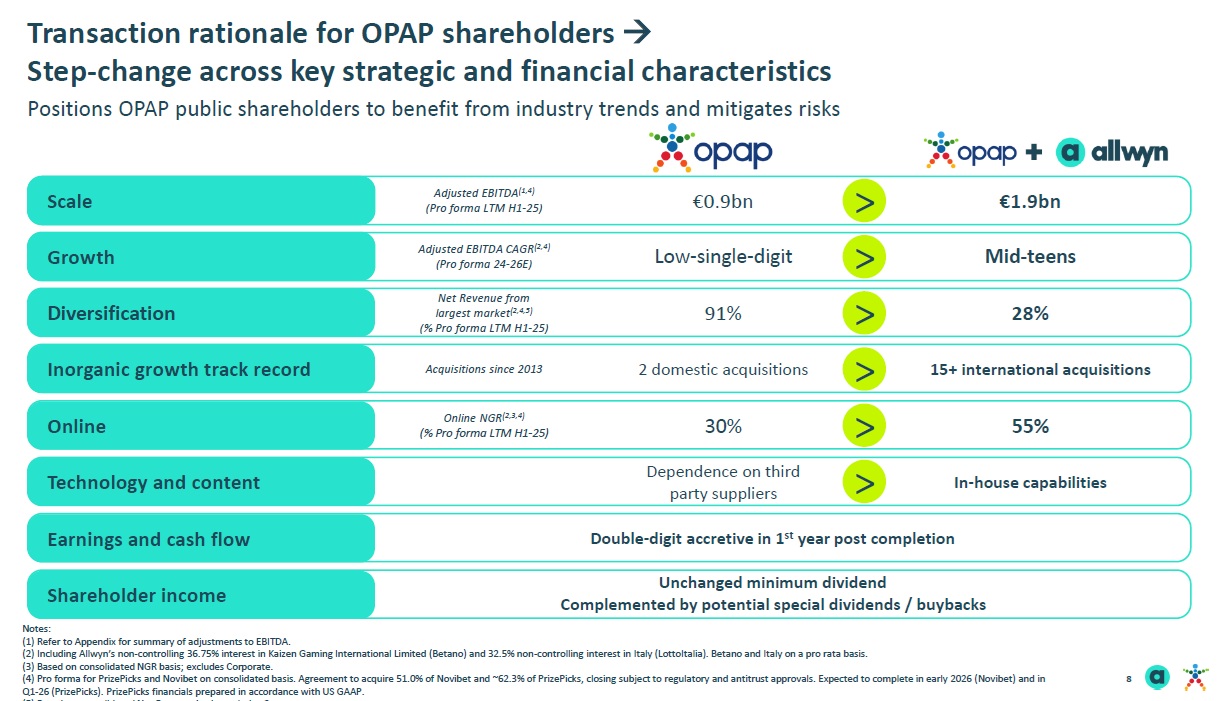 Να σημειωθεί ότι με βάση το χρονοδιάγραμμα η συναλλαγή αναμένεται να ολοκληρωθεί το δεύτερο τρίμηνο του 2026, αφού προηγηθούν οι εγκρίσεις των ρυθμιστικών αρχών και γίνει η Γενική Συνέλευση του OΠΑΠ.