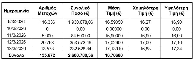 O OTE αγόρασε συνολικά 155.672 ίδιες μετοχές έναντι ω 2.600.780,36 εκατ. ευρώ και με μέση τιμή 16,70680, στο διάστημα από 09/03/2026–13/03/2026