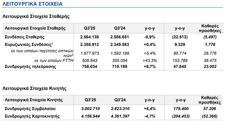 • Τα έσοδα από υπηρεσίες κινητής αυξήθηκαν κατά 2,7% στο Γ’ τρίμηνο του 2025, διατηρώντας τη θετική δυναμική των προηγούμενων τριμήνων. Ο τομέας των συμβολαίων συνεχίζει να ενισχύεται, κυρίως χάρη στη μετάβαση πελατών καρτοκινητής σε υπηρεσίες συμβολαίου, καθώς και τη μετάβαση των πελατών σε υπηρεσίες υψηλότερης αξίας. Επιπλέον, η Εταιρεία έχει τροποποιήσει το πορτφόλιο υπηρεσιών καρτοκινητής στα φυσικά της κανάλια, διαθέτοντας προτάσεις μεγαλύτερης αξίας, που υποστηρίζουν περαιτέρω την ανάπτυξη της κινητής. Η εν λόγω πρωτοβουλία ενισχύει το μέσο έσοδο ανά πελάτη (ARPU), ενώ ταυτόχρονα διευκολύνει τη σταδιακή μετακίνηση των πελατών σε υπηρεσίες συμβολαίου.