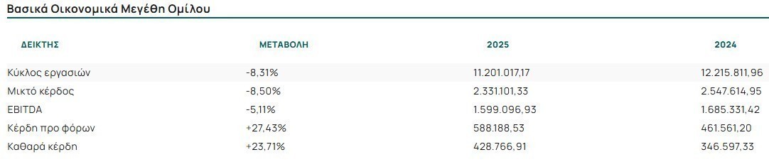 Παράλληλα, τα λειτουργικά κέρδη προ φόρων, χρηματοδοτικών και επενδυτικών αποτελεσμάτων και αποσβέσεων (EBITDA) ανήλθαν σε €1.599.096,93 έναντι €1.685.331,42, παρουσιάζοντας μείωση της τάξεως του 5%.