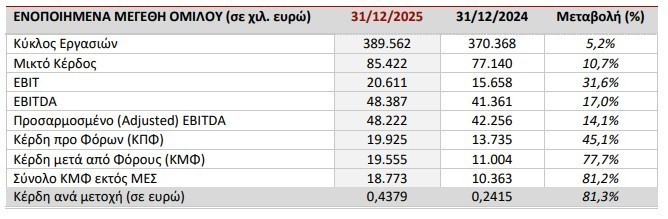 Συγκεκριμένα, ο Κύκλος Εργασιών του Ομίλου ανήλθε σε €389,6 εκατ., έναντι €370,4 εκατ. το 2024, παρουσιάζοντας αύξηση 5,2%. Η αύξηση αυτή αποδίδεται κυρίως στους αυξημένους όγκους πωλήσεων, οι οποίοι κατέγραψαν άνοδο 7,2%, παρά τις πιέσεις και την αβεβαιότητα του οικονομικού και γεωπολιτικού περιβάλλοντος.