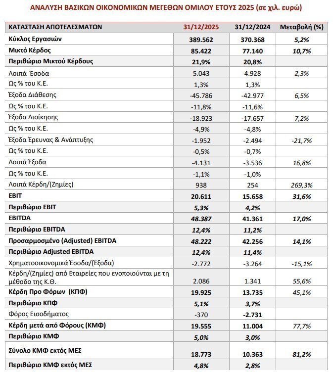 Η λειτουργική κερδοφορία EBITDA ανήλθε σε €48,4 εκατ., αυξημένη κατά 17%, σε σύγκριση με το 2024, όπου είχε διαμορφωθεί σε €41,4 εκατ. Σε επίπεδο προσαρμοσμένου EBITDA, η αύξηση ανήλθε σε 14,1%, συγκριτικά με το 2024. Τα Κέρδη προ Φόρων (ΚΠΦ) για το 2025 ανήλθαν σε 19,9 εκατ., αυξημένα κατά 45,1%, συγκριτικά με το προηγούμενο έτος. Η εξέλιξη αυτή καταδεικνύει τη σημαντική βελτίωση της λειτουργικής κερδοφορίας του Ομίλου, παρά τις αντίξοες οικονομικές συνθήκες, τη συνεχιζόμενη χαμηλή ζήτηση και την αύξηση της κοστολογικής βάσης.