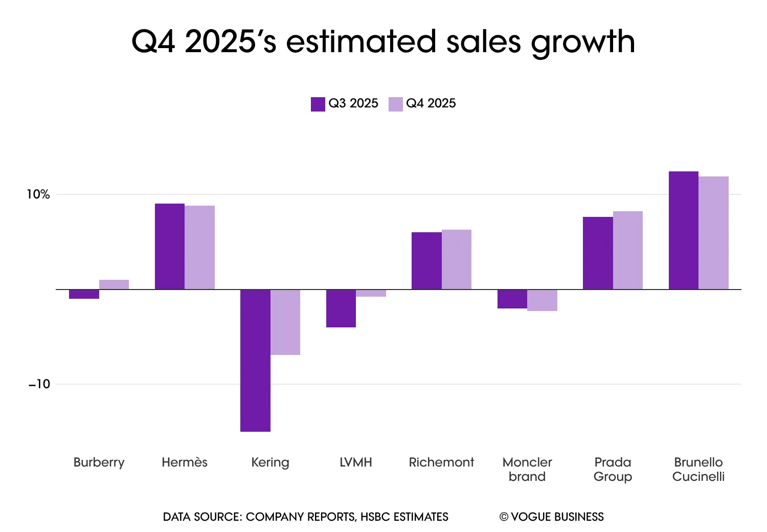 Η Hermès αναμένεται να διατηρήσει την κορυφαία της θέση, με αύξηση πωλήσεων 9,1% το τέταρτο τρίμηνο, έναντι 9,6% το τρίτο. Παράλληλα, η HSBC προβλέπει αύξηση 8,4% στις λιανικές πωλήσεις του ομίλου Prada, 4% για τη Burberry και 2,2% για τη Moncler.