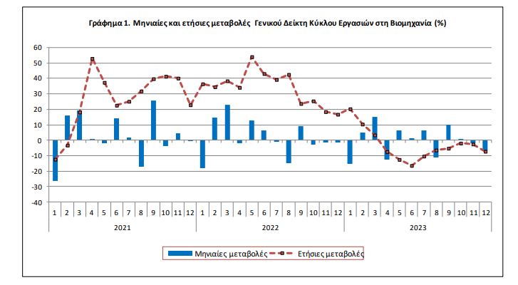 Ο Γενικός Δείκτης Κύκλου Εργασιών στη Βιομηχανία του μηνός Δεκεμβρίου 2023, σε σύγκριση με τον αντίστοιχο δείκτη του Νοεμβρίου 2023, παρουσίασε μείωση 6,3%.