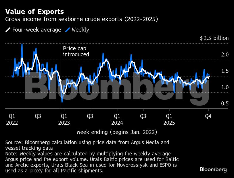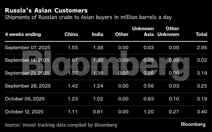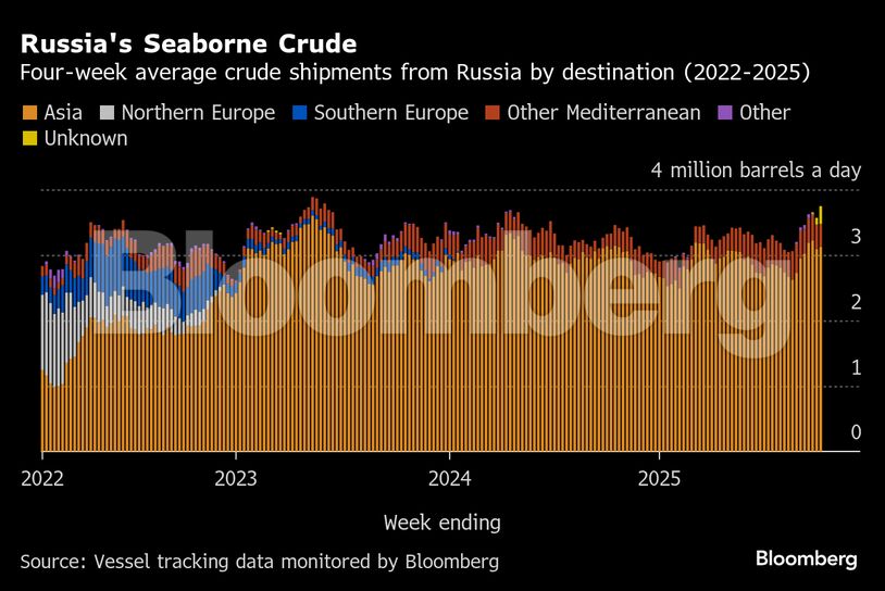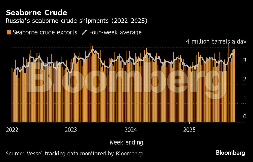 Ο μέσος όρος τετραεβδομαδιαίων αποστολών από τα ρωσικά λιμάνια έφτασε τα 3,74 εκατομμύρια βαρέλια την ημέρα έως τις 12 Οκτωβρίου, σύμφωνα με στοιχεία παρακολούθησης πλοίων που συγκέντρωσε το Bloomberg — το υψηλότερο επίπεδο από τον Ιούνιο του 2023.