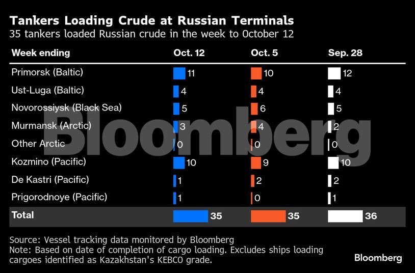 Σύμφωνα με τα στοιχεία παρακολούθησης πλοίων και τις αναφορές πρακτόρων λιμένων, 35 δεξαμενόπλοια φόρτωσαν 27,2 εκατ. βαρέλια ρωσικού αργού την εβδομάδα έως τις 12 Οκτωβρίου — σχεδόν αμετάβλητο από τα 27,17 εκατ. βαρέλια την προηγούμενη εβδομάδα, με τον ίδιο αριθμό πλοίων.