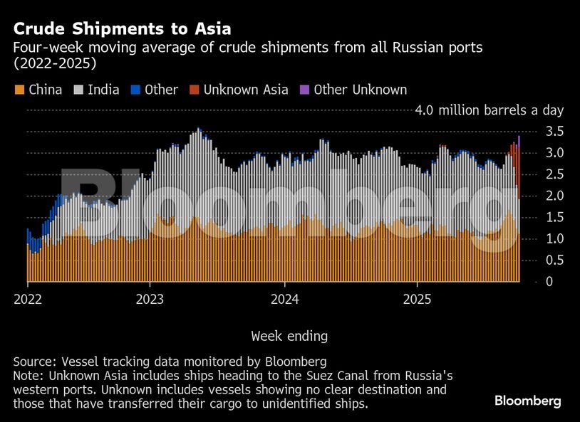 Οι παρατηρούμενες αποστολές προς ασιατικές χώρες — συμπεριλαμβανομένων εκείνων χωρίς δηλωμένο τελικό προορισμό — αυξήθηκαν στα 3,4 εκατ. βαρέλια/ημέρα κατά τις 28 ημέρες έως τις 12 Οκτωβρίου, από 3,19 εκατ. την προηγούμενη περίοδο, φτάνοντας σε υψηλό από τον Ιούνιο του 2023.