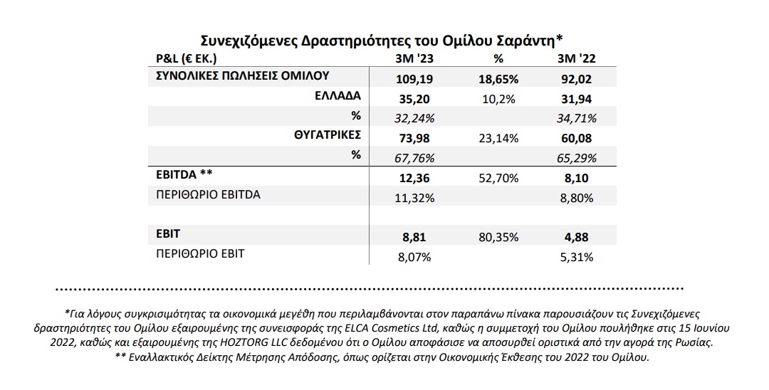 Κατά τη διάρκεια του Α’ τριμήνου 2023, οι πωλήσεις του Ομίλου αυξήθηκαν κατά 18,65% και ανήλθαν σε € 109,19 εκ. από € 92,02 εκ. που είχαν διαμορφωθεί κατά την αντίστοιχη περυσινή περίοδο.