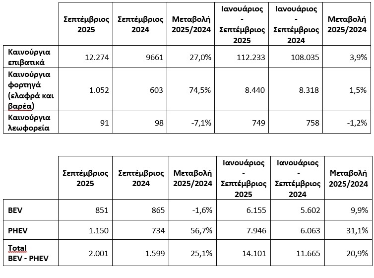 Αύξηση 3,9% παρουσίασαν οι ταξινομήσεις νέων αυτοκινήτων το διάστημα Ιανουαρίου-Σεπτεμβρίου, σε σχέση με το ίδιο 9άμηνο το 2024, σύμφωνα με τον ΣΕΑΑ (Σύνδεσμος Εισαγωγέων Αντιπροσώπων Αυτοκινήτων). Για τον μήνα Σεπτέμβριο, οι νέες ταξινομήσεις εμφάνισαν άνοδο 27% σε σχέση με τον ίδιο μήνα πέρυσι.