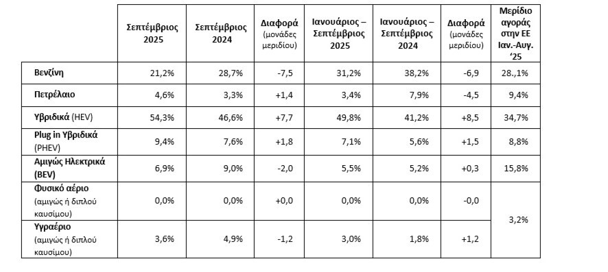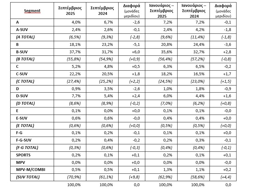 Σύμφωνα με πρώτους υπολογισμούς, η πρόοδος στα segments επιβατικών και στην κατανομή ανά καύσιμο, ως τον Σεπτέμβριο, έχει ως εξής: