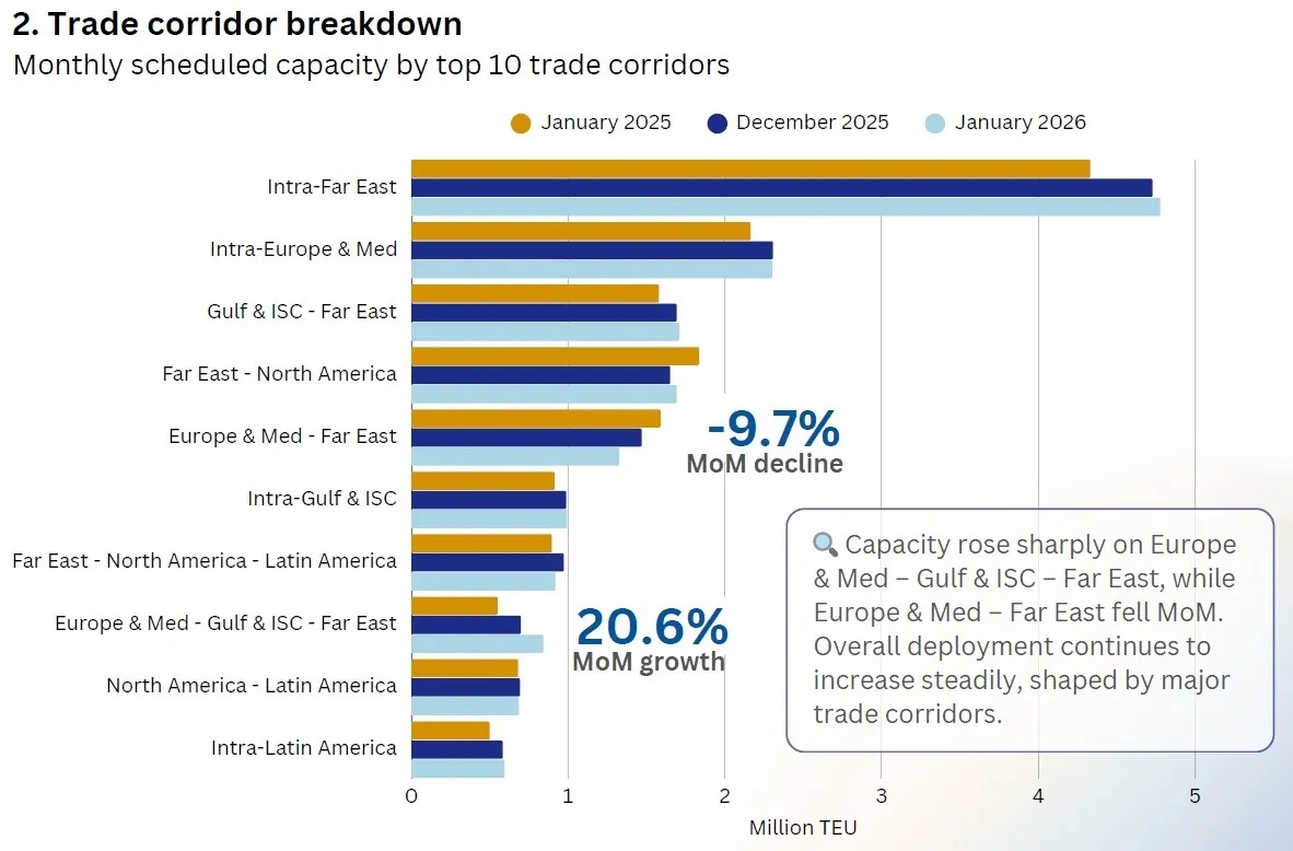 Η διαθέσιμη χωρητικότητα στην αγορά μεταφοράς εμπορευματοκιβωτίων τον Ιανουάριο έφτασε τα 21,37 εκατομμύρια TEU, σημειώνοντας αύξηση 0,3% σε σύγκριση με τον προηγούμενο μήνα και αύξηση 7% σε σύγκριση με τις αρχές του 2025.