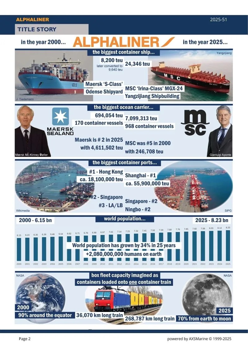 Ξεκινώντας από τη σύγκριση μεταξύ του παγκόσμιου πληθυσμού του 2000, που ήταν 6,15 δισεκατομμύρια άνθρωποι και του 2025, που ανέρχονται σε 8,23 δισεκατομμύρια, με αύξηση 34%, η εταιρεία ανάλυσης επισήμανε την έκρηξη των συνολικών κοντέινερ, από 4,51 σε 33,6 εκατομμύρια TEU, του αριθμού των πλοίων μεταφοράς εμπορευματοκιβωτίων, από 2.622 σε 7.492, της μέσης χωρητικότητας των πλοίων, από 1.700 σε 4.500 TEU, της συγκέντρωσης της αγοράς, με τους πρώτους 10 μεταφορείς να κατέχουν από το 61% στο 84% του παγκόσμιου μεταφορών με πλοία εμπορευματοκιβωτίων, του βιβλίου παραγγελιών, που είναι 11 εκατομμύρια TEU, ίσο με περισσότερο από το διπλάσιο του στόλου του 2000.