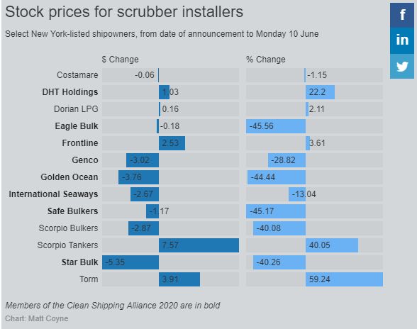 Αυτό προκύπτει από το γεγονός ότι οι μετοχές των περισσότερων εισηγμένων στη Νέα Υόρκη ναυτιλιακών εταιρειών έχουν καταγράψει απώλειες από τότε που ανακοίνωσαν ότι θα εξοπλίσουν τα πλοία τους με scrubbers.