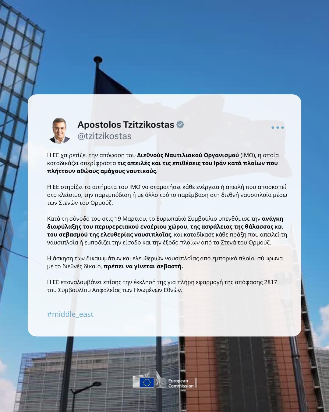«Η Ευρωπαϊκή Ένωση ζητά να σταματήσει κάθε ενέργεια ή απειλή που αποσκοπεί στο κλείσιμο, την παρεμπόδιση ή με άλλο τρόπο παρέμβαση στη διεθνή ναυσιπλοΐα μέσω των Στενών του Ορμούζ».