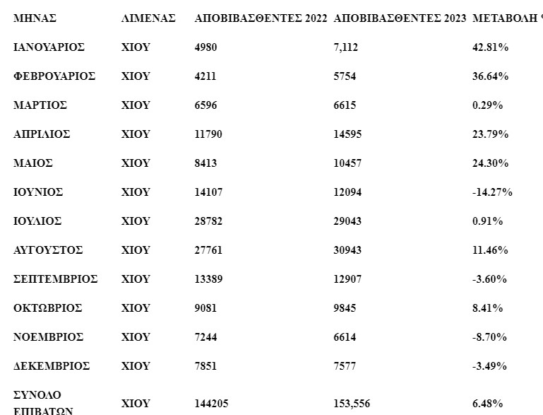 Σύμφωνα με το στοιχεία του Κεντρικού Λιμεναρχείου Χίου, στο νησί της Χίου αποβιβάστηκαν με ακτοπλοϊκά πλοία της γραμμής 153.556 επιβάτες, σημειώνοντας αύξηση κατά 6,48%, σε σύγκριση με την αντίστοιχη περίοδο του έτους 2022.