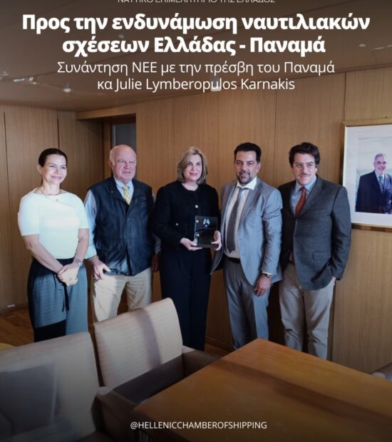 Το Ναυτικό Επιμελητήριο της Ελλάδος (ΝΕΕ) υποδέχθηκε στα γραφεία του την Πρέσβη του Παναμά, κα Julie Lymberopulos Karnakis, συνοδευόμενη από τη Γραμματέα του Ναυτικού Επιμελητηρίου του Παναμά, κα Ηλέκτρα Καρνάκη.
