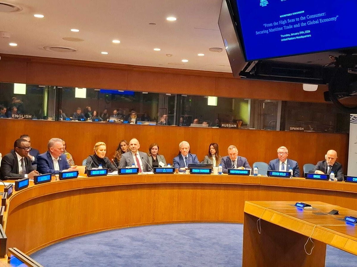 Ο κ. Γεραπετρίτης μίλησε στο πλαίσιο συζήτησης που διοργάνωσε το Οικονομικό Φόρουμ των Δελφών, σε συνεργασία με τη Μόνιμη Αντιπροσωπεία της Ελλάδας στα Ηνωμένα Έθνη. Η συζήτηση με τίτλο «Από τις Ανοιχτές Θάλασσες στον Καταναλωτή: Διασφαλίζοντας το ναυτιλιακό εμπόριο και την παγκόσμια οικονομία» πραγματοποιήθηκε την Πέμπτη 29 Ιανουαρίου 2026 στα κεντρικά γραφεία του ΟΗΕ στη Νέα Υόρκη.