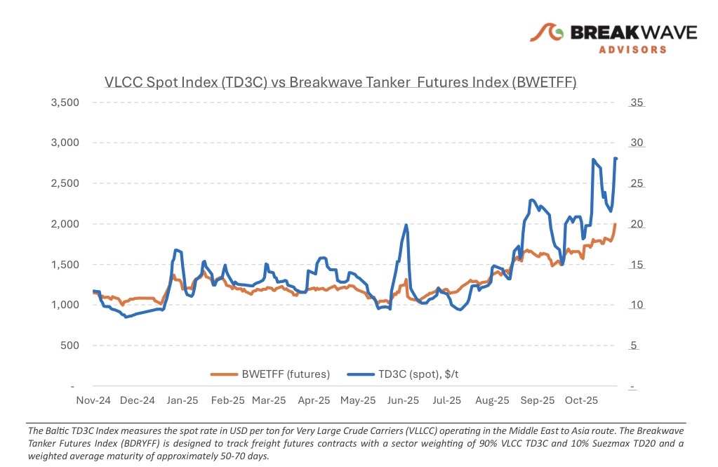 Η αγορά των πολύ μεγάλων τάνκερ VLCC συνέχισε την ισχυρή ανοδική πορεία της μέσα στο Νοέμβριο, με την αυξανόμενη ζήτηση για αργό πετρέλαιο να υπερκαλύπτει τα διαθέσιμα δεξαμενόπλοια στα βασικά λιμάνια φόρτωσης, επισημαίνει ο Γιάννης Κάρτσωνας, διευθύνων σύμβουλος της Breakwave Advisors.