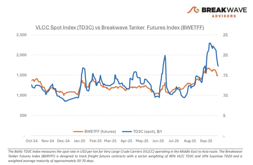 Στο τέλος Σεπτεμβρίου, η αγορά για τα μεγάλα δεξαμενόπλοια μεταφοράς αργού (VLCC), η οποία μέχρι πρότινος ήταν ισχυρή λόγω περιορισμένης διαθεσιμότητα πλοίων αλλά και υψηλής δραστηριότητας, παρουσίασε σημάδια επιβράδυνσης, επισημαίνει ο Γιάννης Κάρτσωνας, διευθύνων σύμβουλος της Breakwave Advisors.