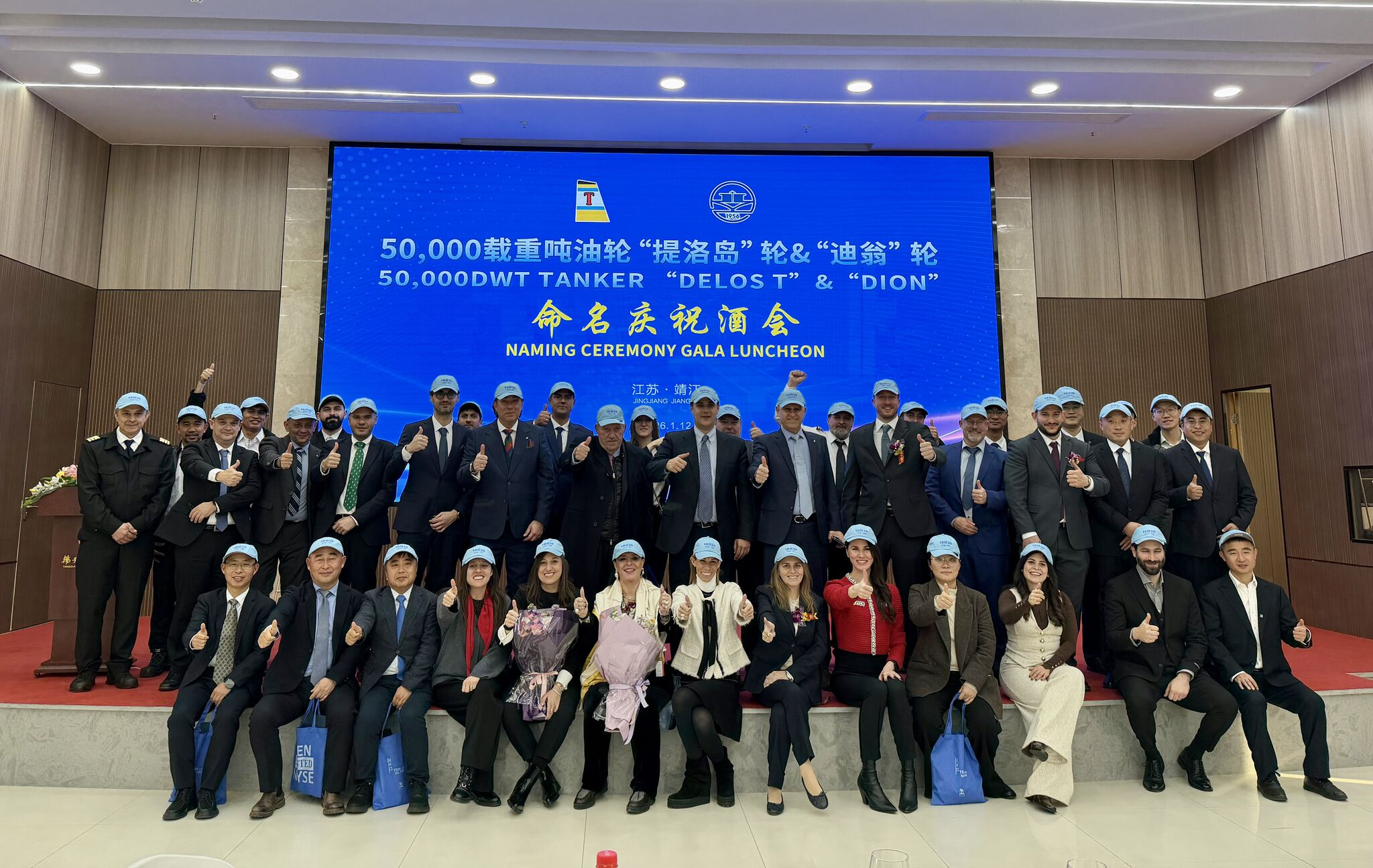 Οι νονές των πλοίων είναι, του M/T “DELOS T”, η Κορίνα Λαζάρου, P.A. του Δρ. Νικόλα Π. Τσάκου, TEN Ltd και το M/T “DION”, η Ελίνα Παπαγεωργίου, επικεφαλής Ελλάδας και Κύπρου του Lloyd’s Register of Shipping.