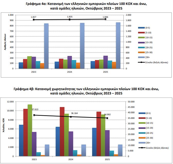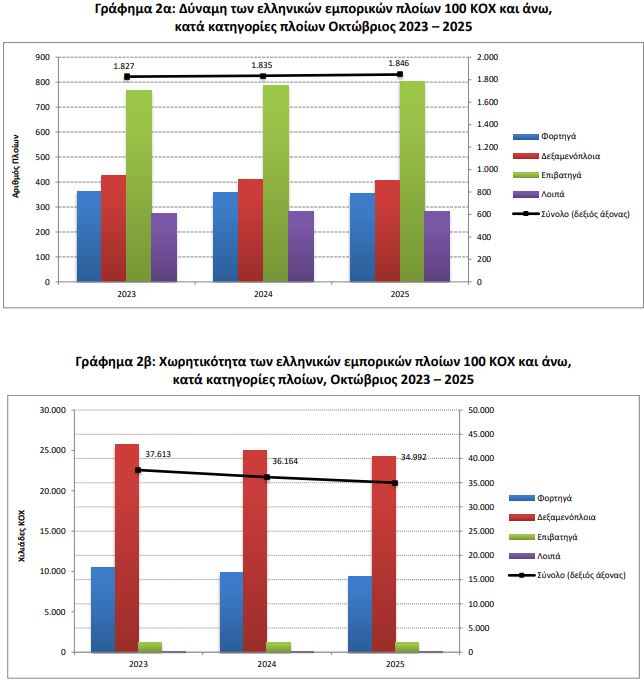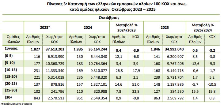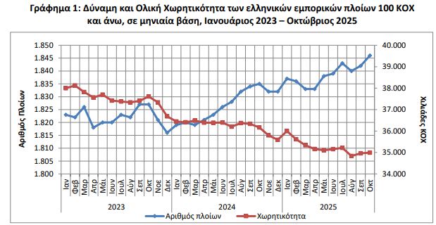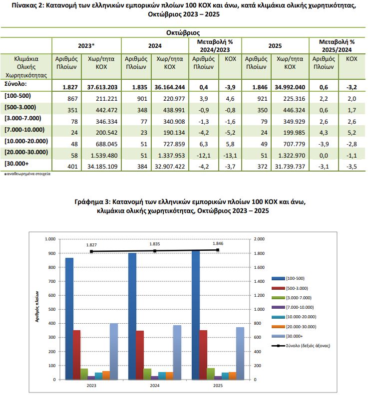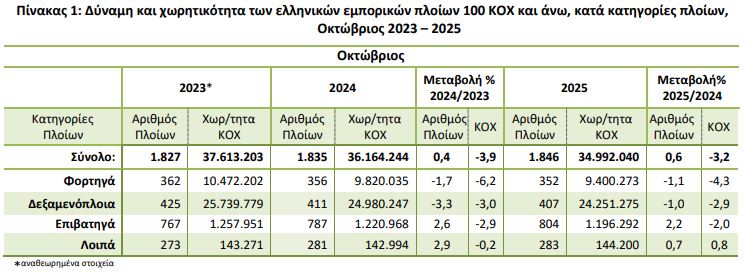 Η Ολική Χωρητικότητα του Ελληνικού Εμπορικού Στόλου, από πλοία 100 ΚΟΧ και άνω, παρουσίασε μείωση κατά 3,2% τον μήνα Οκτώβριο 2025 σε σύγκριση με την αντίστοιχη χωρητικότητα του Οκτωβρίου 2024. Μείωση 3,9% είχε σημειωθεί και κατά την αντίστοιχη σύγκριση του Οκτωβρίου του έτους 2024 προς τον Οκτώβριο 2023.